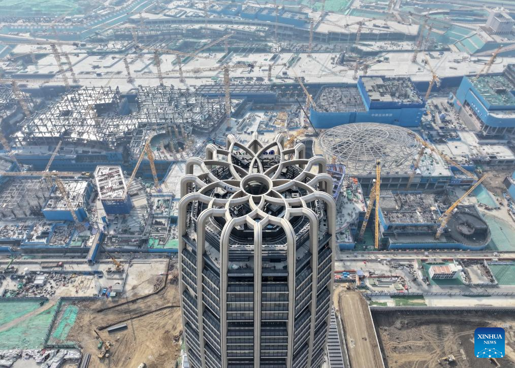 A drone photo taken on Feb. 27, 2025 shows the construction site of Sinochem Holdings building and Xiong'an's Guomao area in Xiong'an New Area, north China's Hebei Province. Xiong'an New Area is pushing forward construction projects with top quality and high standards.