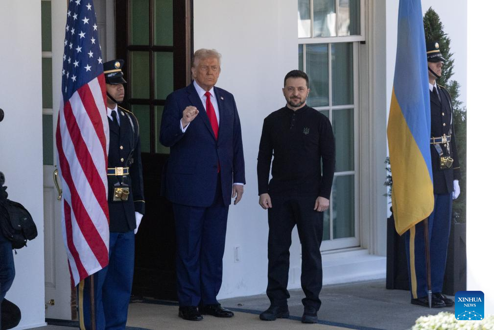 U.S. President Donald Trump (2nd L) welcomes Ukrainian President Volodymyr Zelensky (2nd R) at the White House in Washington, D.C., the United States, on Feb. 28, 2025. A press conference at the White House scheduled for Friday where U.S. President Donald Trump and Ukrainian President Volodymyr Zelensky planned to sign the U.S.-Ukraine minerals deal was canceled, following a tense shouting match between the two inside the Oval Office earlier in the day. (Xinhua/Hu Yousong)