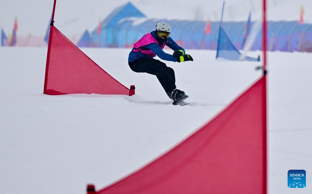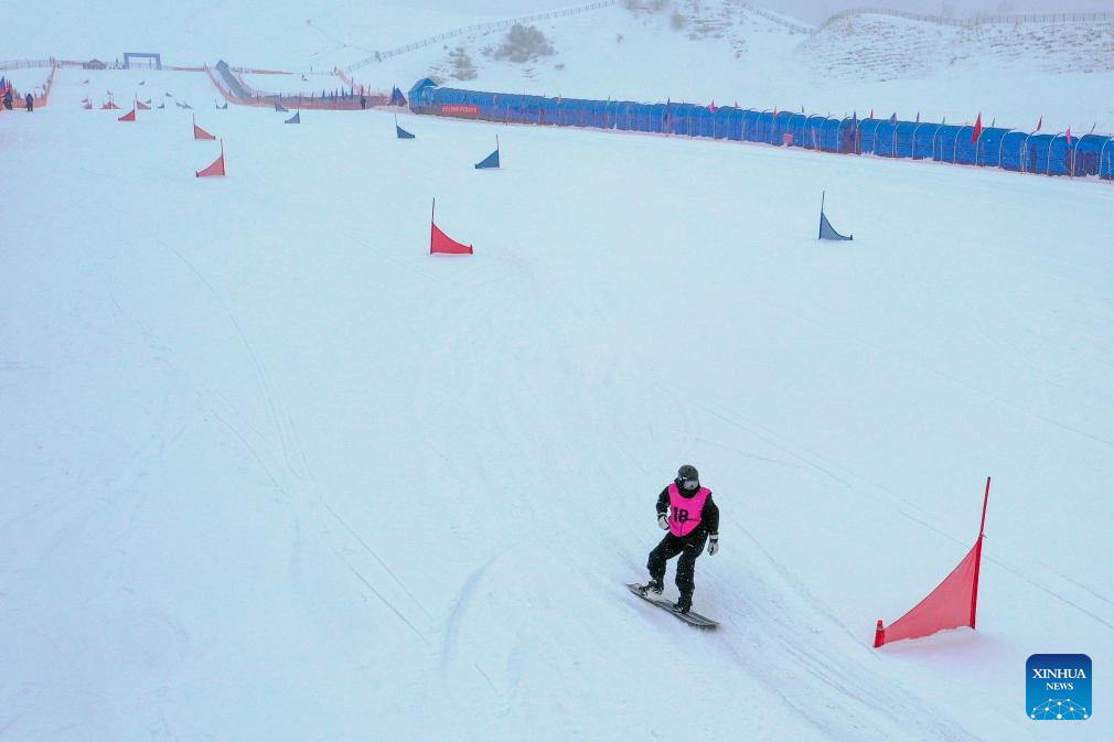 An aerial photo taken on March 1, 2025 shows Wang Tao of Jiangsu ice and snow sports association competes during the giant slalom of the 2025 "Ice and Snow Silk Road Cup" Narati International Alpine Skiing Invitational in Xinyuan County, Ili Kazak Autonomous Prefecture, northwest China's Xinjiang Uygur Autonomous Region. (Xinhua/Ding Lei)