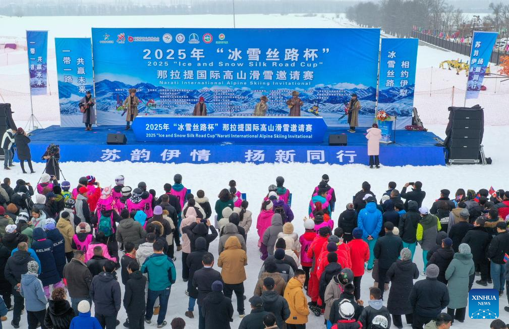 An aerial photo taken on March 1, 2025 shows the opening ceremony of the 2025 "Ice and Snow Silk Road Cup" Narati International Alpine Skiing Invitational in Xinyuan County, Ili Kazak Autonomous Prefecture, northwest China's Xinjiang Uygur Autonomous Region. (Xinhua/Ding Lei)
