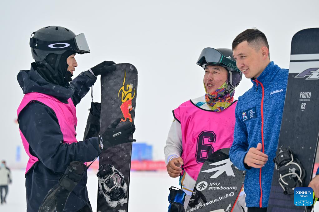 Ma Zhaoyang (L) of Jiangsu ice and snow sports association talks with Mirzalyev Ernur (R) and Ubayev Otabek of Uzbekistan National Sports University after the giant slalom of the 2025 "Ice and Snow Silk Road Cup" Narati International Alpine Skiing Invitational in Xinyuan County, Ili Kazak Autonomous Prefecture, northwest China's Xinjiang Uygur Autonomous Region on March 1, 2025. (Xinhua/Ding Lei)