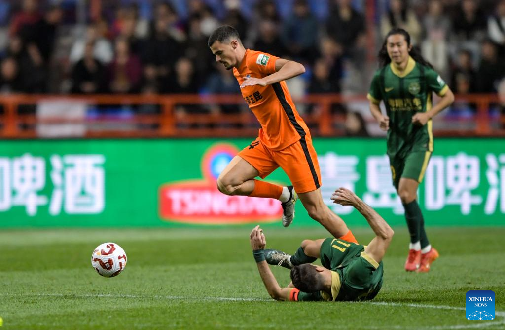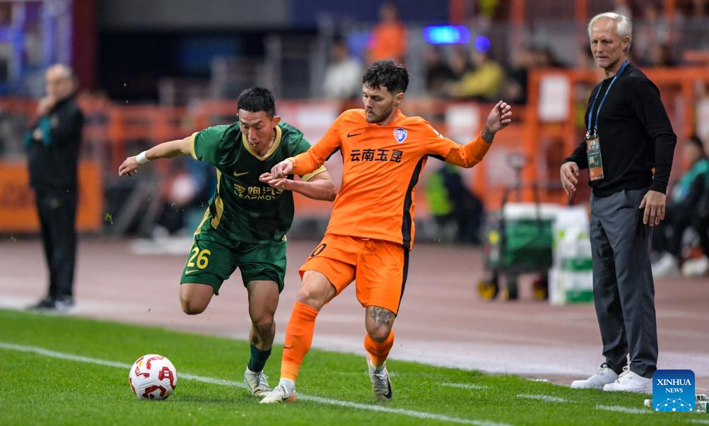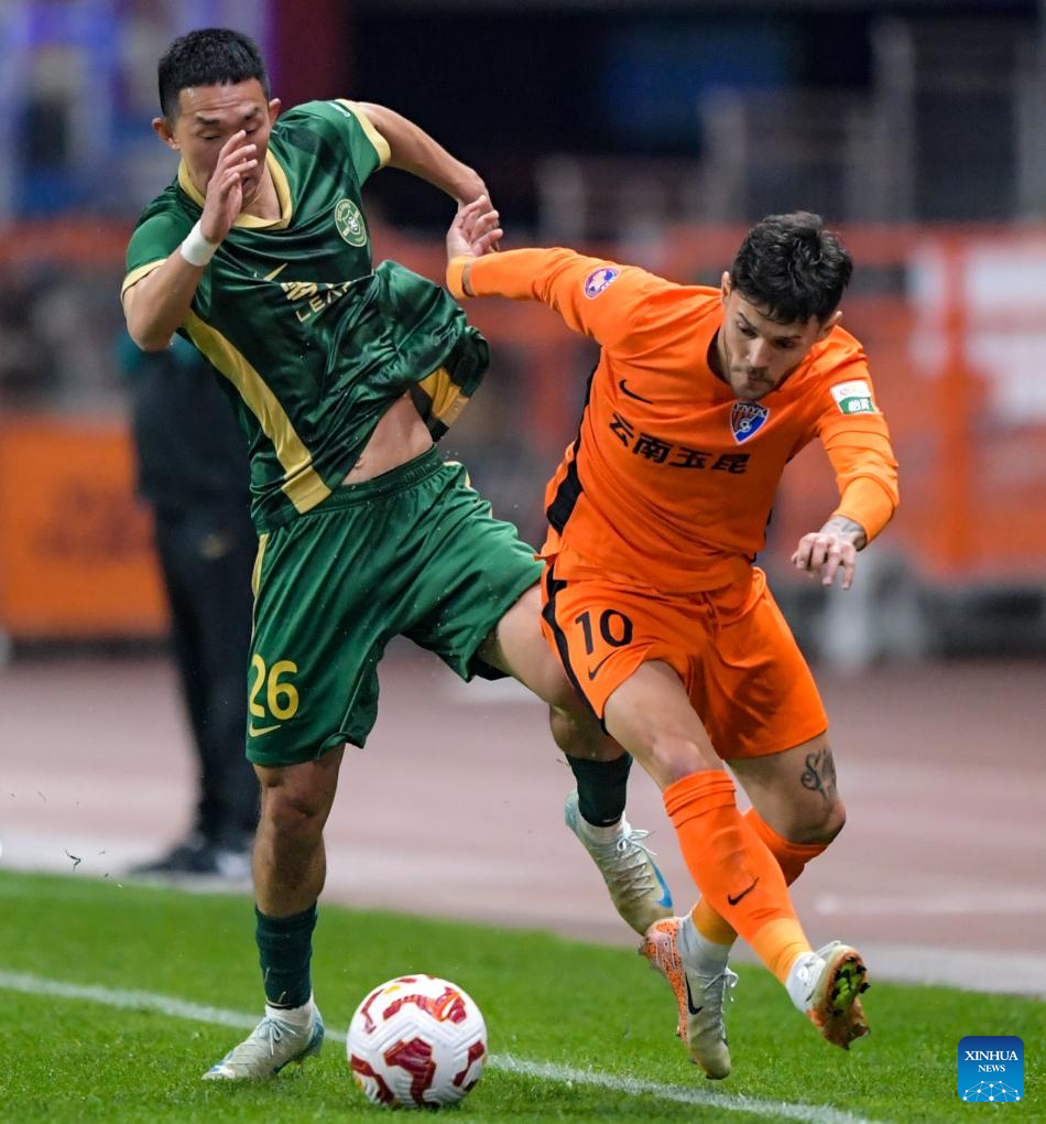 Nene (top) of Yunnan Yukun breaks through during the 2nd round match between Yunnan Yukun and Zhejiang Greentown at the 2025 Chinese Super League (CSL) in Yuxi, southwest China's Yunnan Province, March 1, 2025. (Xinhua/Chen Xinbo)