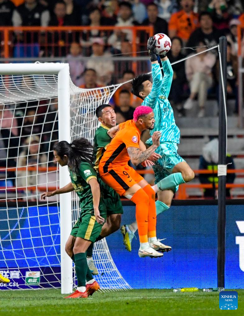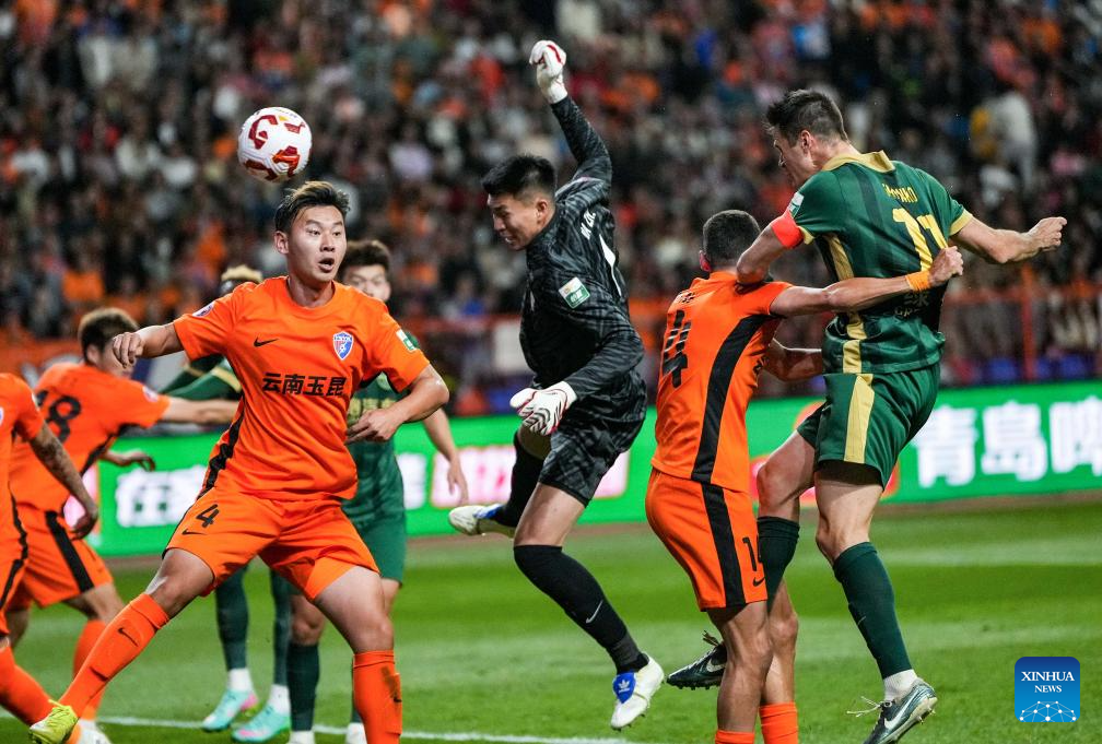 Goalkeeper of Zhejiang Greentown Zhao Bo (1st R) makes a save during the 2nd round match between Yunnan Yukun and Zhejiang Greentown at the 2025 Chinese Super League (CSL) in Yuxi, southwest China's Yunnan Province, March 1, 2025. (Xinhua/Chen Xinbo)