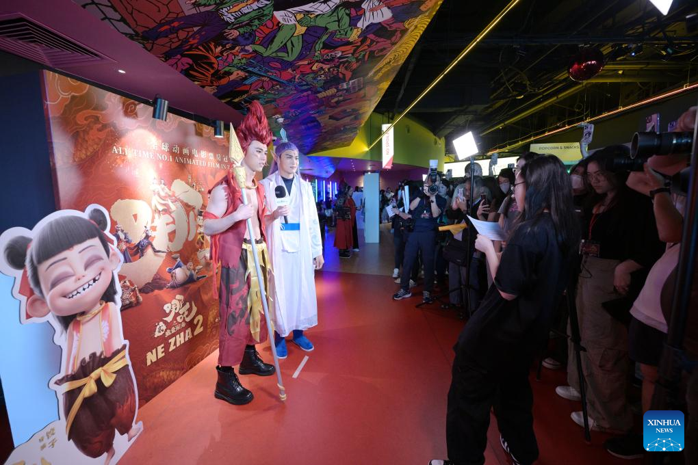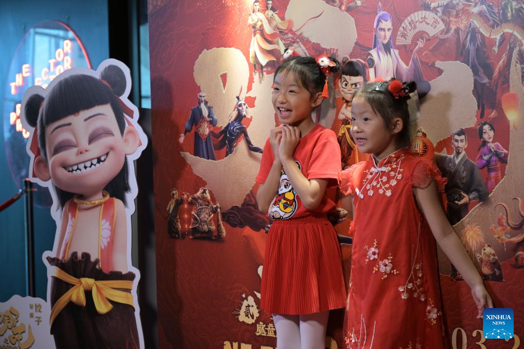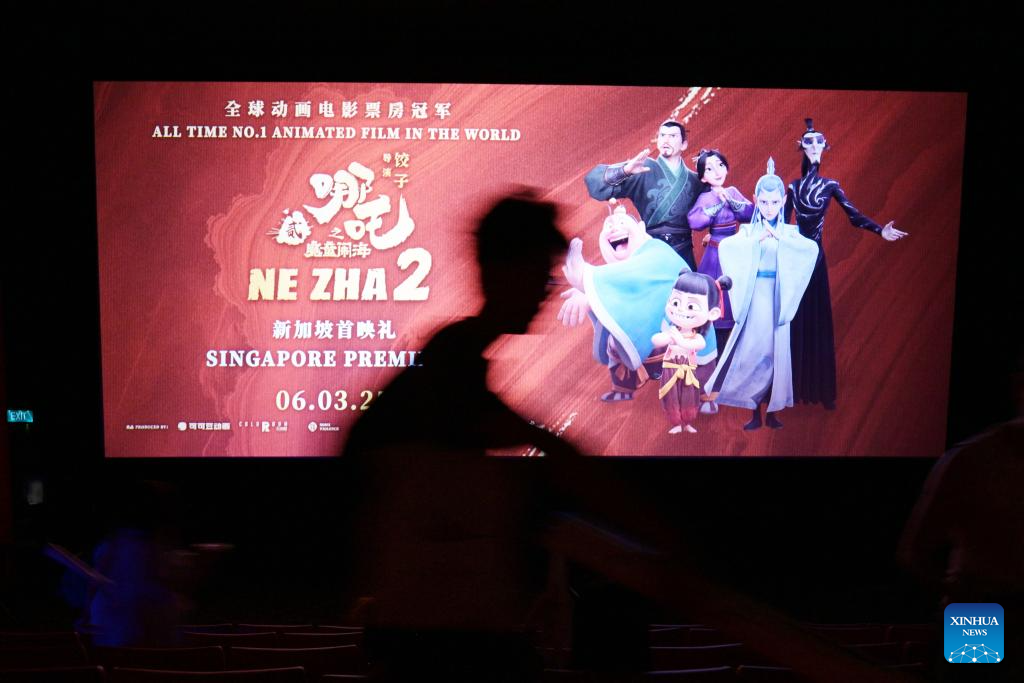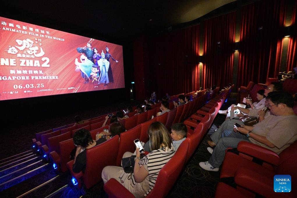 People attend the premiere of the Chinese animated film "Ne Zha 2" at The Projector movie theater in Singapore, on March 2, 2025. The Chinese animated film "Ne Zha 2" will be officially released in Singapore on March 6. (Xinhua/Then Chih Wey)