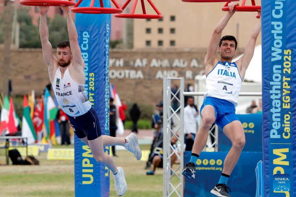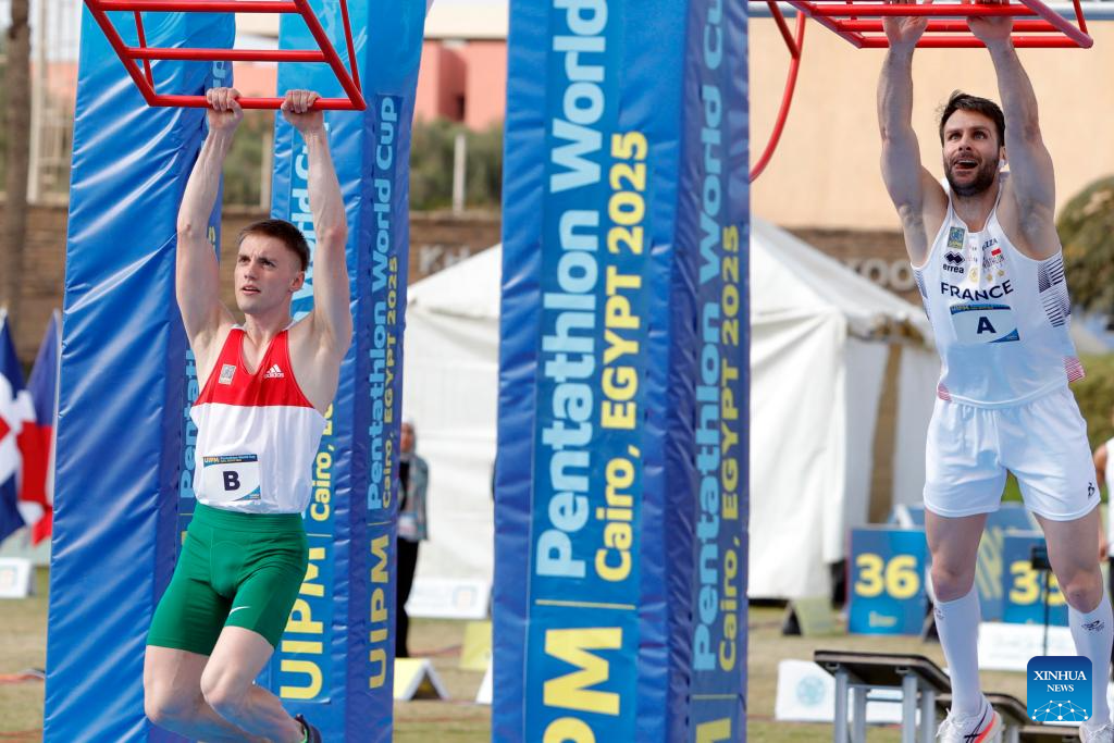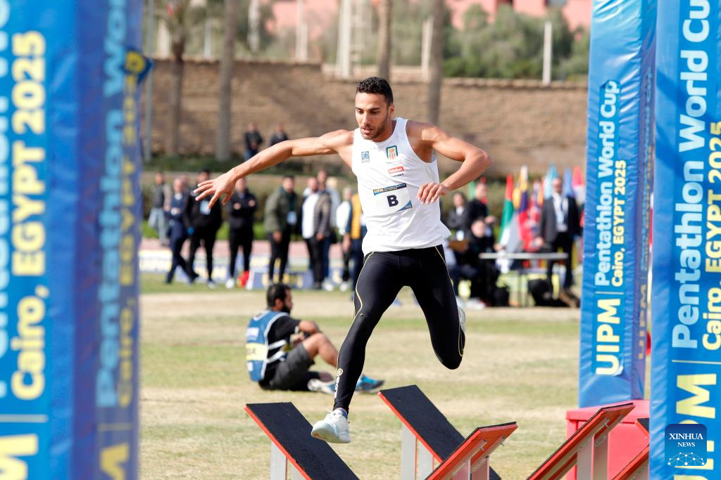 Athletes compete in the obstacle race during the men's final at the UIPM 2025 Pentathlon World Cup in Cairo, Egypt, March 1, 2025. (Xinhua/Ahmed Gomaa)