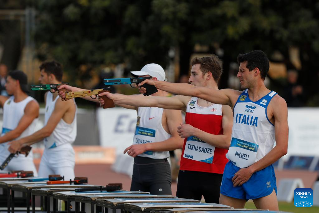 Athletes compete in the laser run during the men's final at the UIPM 2025 Pentathlon World Cup in Cairo, Egypt, March 1, 2025. (Xinhua/Ahmed Gomaa)