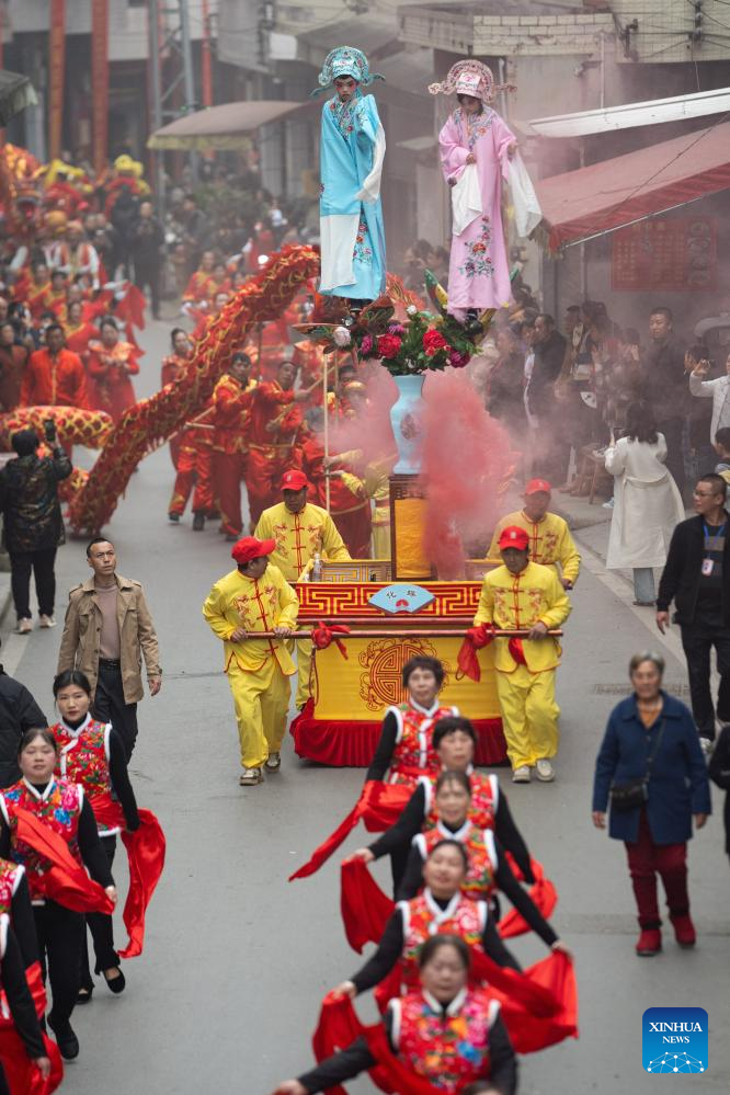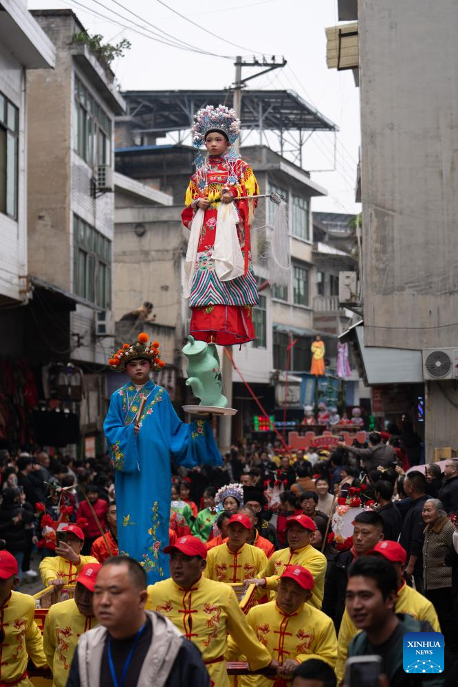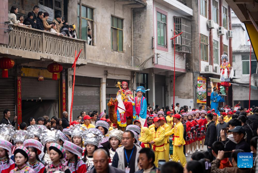 Performers of Daba Gaozhuang march during a parade in Daba Miao Township of Xingwen County, southwest China's Sichuan Province, March 1, 2025.