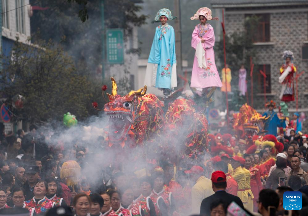 Dragon and lion dance teams march during a parade featuring Daba Gaozhuang in Daba Miao Township of Xingwen County, southwest China's Sichuan Province, March 1, 2025.