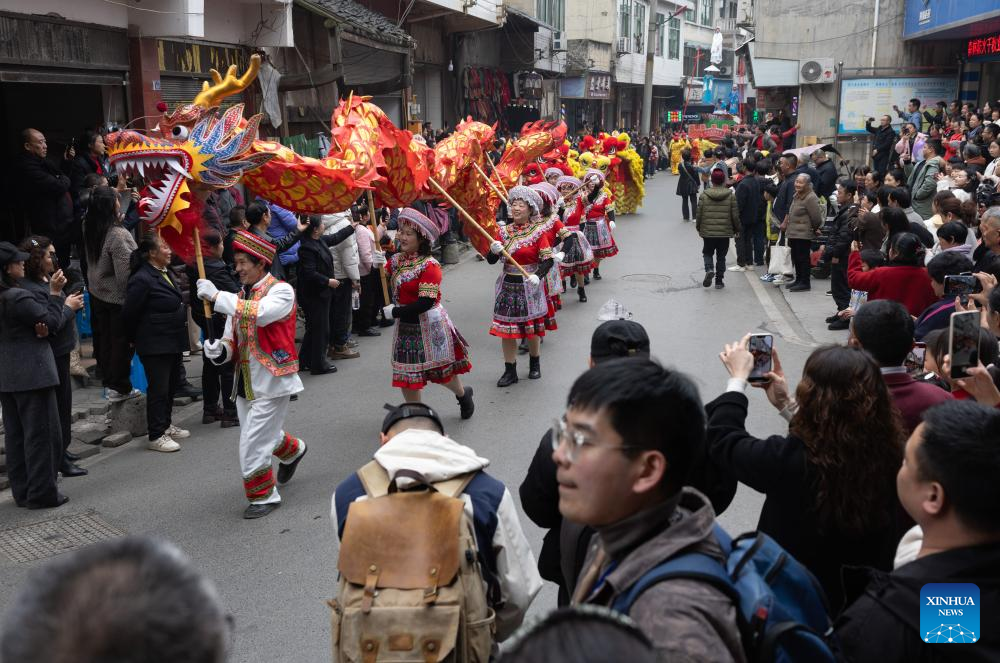 Dragon dance teams march during a parade featuring Daba Gaozhuang in Daba Miao Township of Xingwen County, southwest China's Sichuan Province, March 1, 2025.