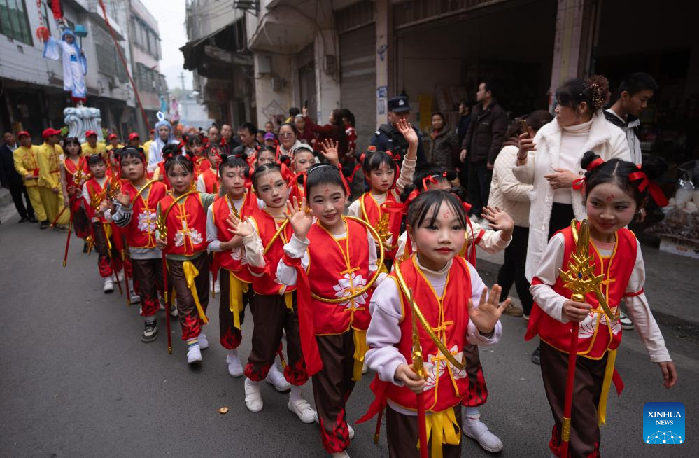 Children dressed as Ne Zha, a character from Chinese mythology, march during a parade featuring Daba Gaozhuang in Daba Miao Township of Xingwen County, southwest China's Sichuan Province, March 1, 2025.