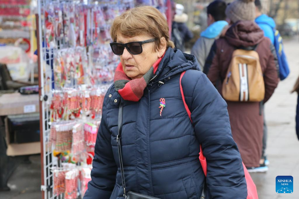 A woman wearing a Martenitsa walks on a street in Sofia, Bulgaria, March 1, 2025. Bulgarians marked the day named Baba Marta on Saturday. On Barba Marta and a few days afterwards, people will follow the tradition of wearing "Martenitsa," a small piece of adornment made of white and red yarn or silk threads. (Xinhua/Lin Hao)