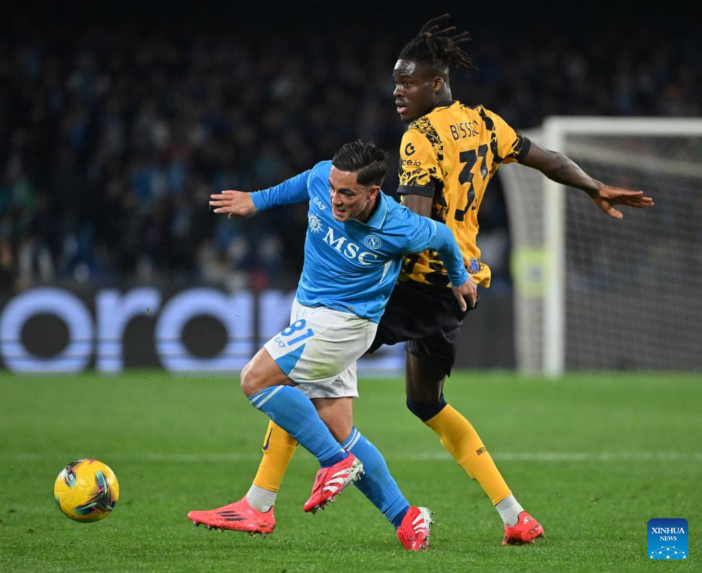 Inter Milan's Yann Bisseck (R) vies with Napoli's Giacomo Raspadori during a Serie A football match between Napoli and Inter Milan in Naples, Italy, March 1, 2025. (Photo by Alberto Lingria/Xinhua)