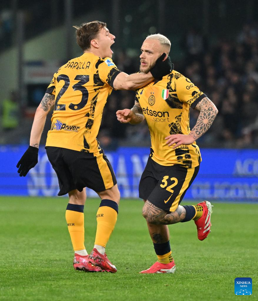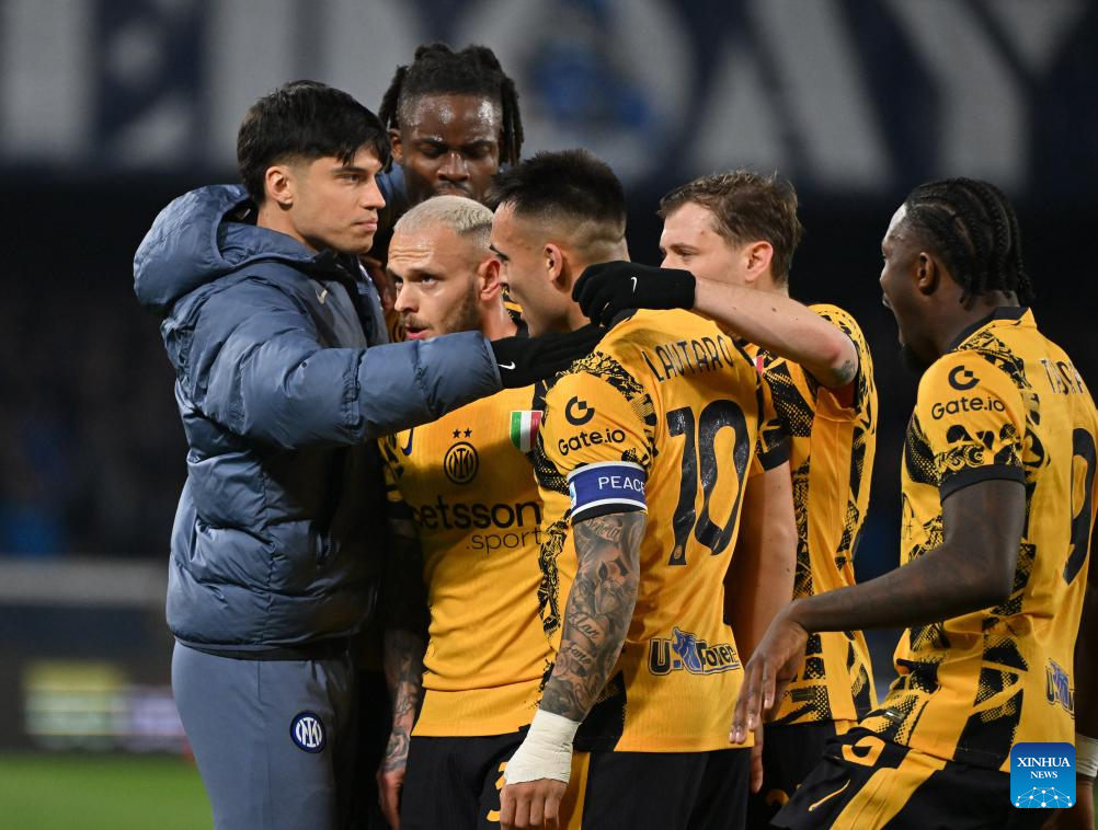 Inter Milan's Federico Dimarco (2nd L) celebrates his goal with teammates during a Serie A football match between Napoli and Inter Milan in Naples, Italy, March 1, 2025. (Photo by Alberto Lingria/Xinhua)