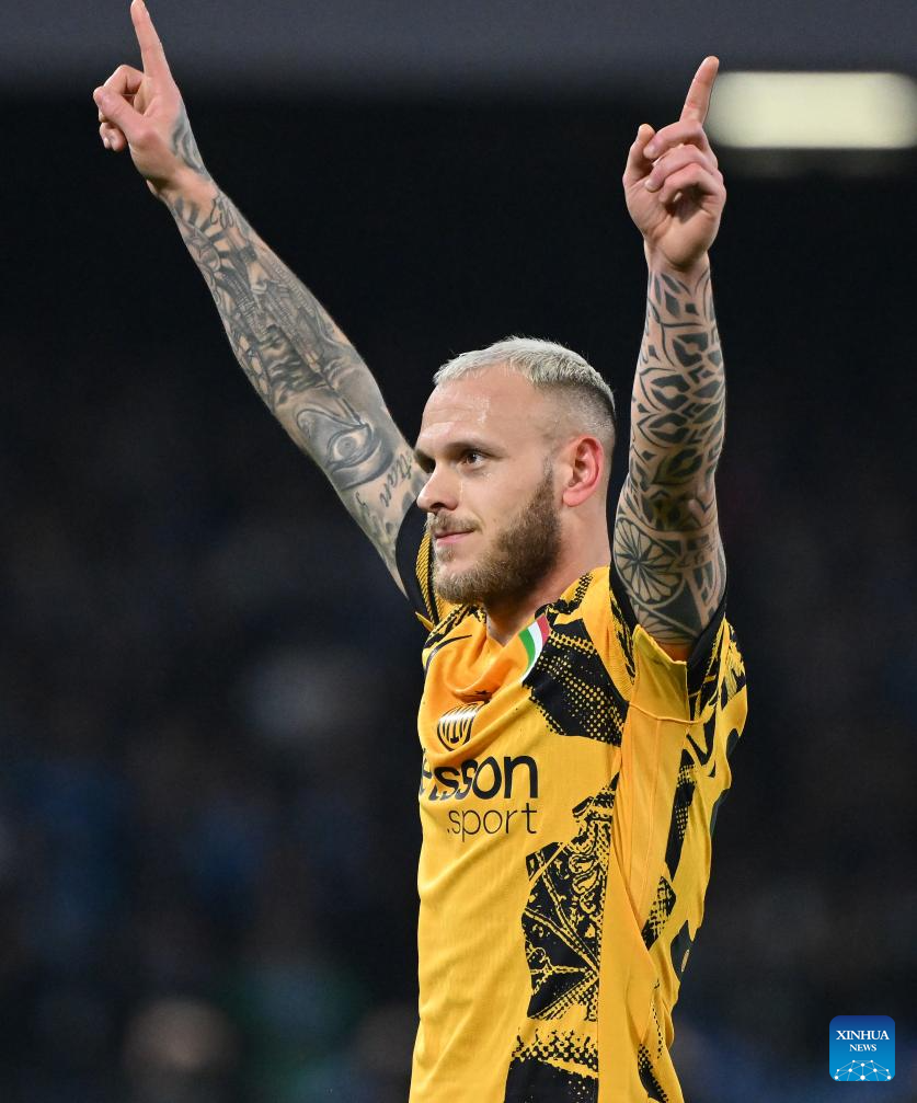 Inter Milan's Federico Dimarco celebrates during a Serie A football match between Napoli and Inter Milan in Naples, Italy, March 1, 2025. (Photo by Alberto Lingria/Xinhua)