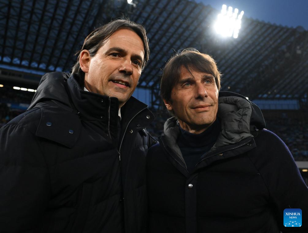 Inter Milan's head coach Simone Inzaghi (L) greets Napoli's head coach Antonio Conte before a Serie A football match between Napoli and Inter Milan in Naples, Italy, March 1, 2025. (Photo by Alberto Lingria/Xinhua)