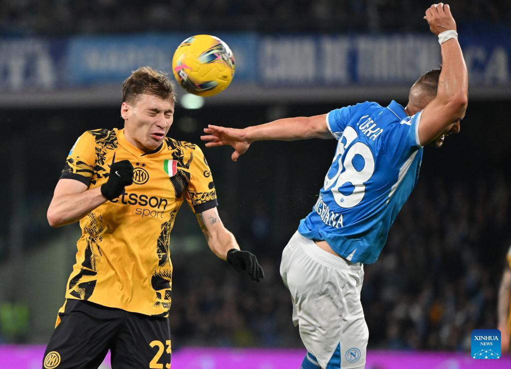Inter Milan's Nicolo Barella (L) vies with Napoli's Stanislav Lobotka during a Serie A football match between Napoli and Inter Milan in Naples, Italy, March 1, 2025. (Photo by Alberto Lingria/Xinhua)