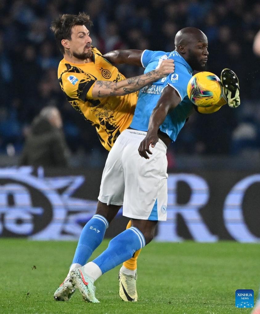 Inter Milan's Francesco Acerbi (L) vies with Napoli's Romelu Lukaku during a Serie A football match between Napoli and Inter Milan in Naples, Italy, March 1, 2025. (Photo by Alberto Lingria/Xinhua)