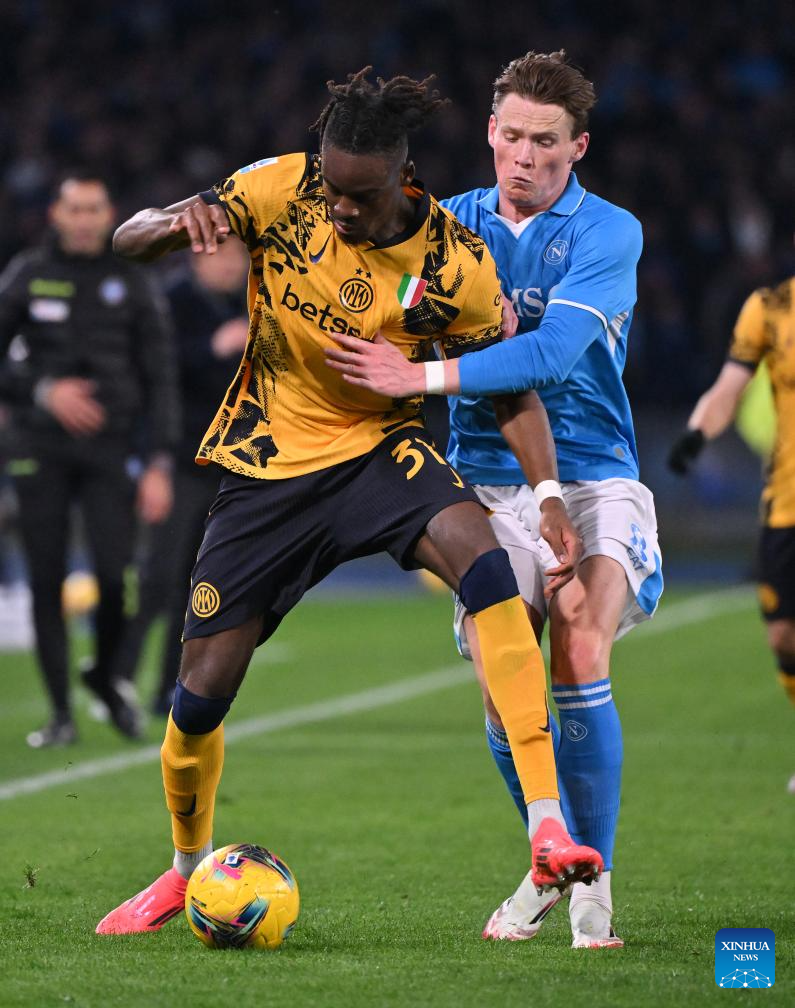 Inter Milan's Yann Bisseck (L) vies with Napoli's Scott McTominay during a Serie A football match between Napoli and Inter Milan in Naples, Italy, March 1, 2025. (Photo by Alberto Lingria/Xinhua)