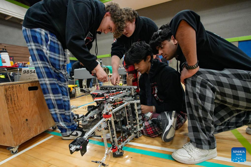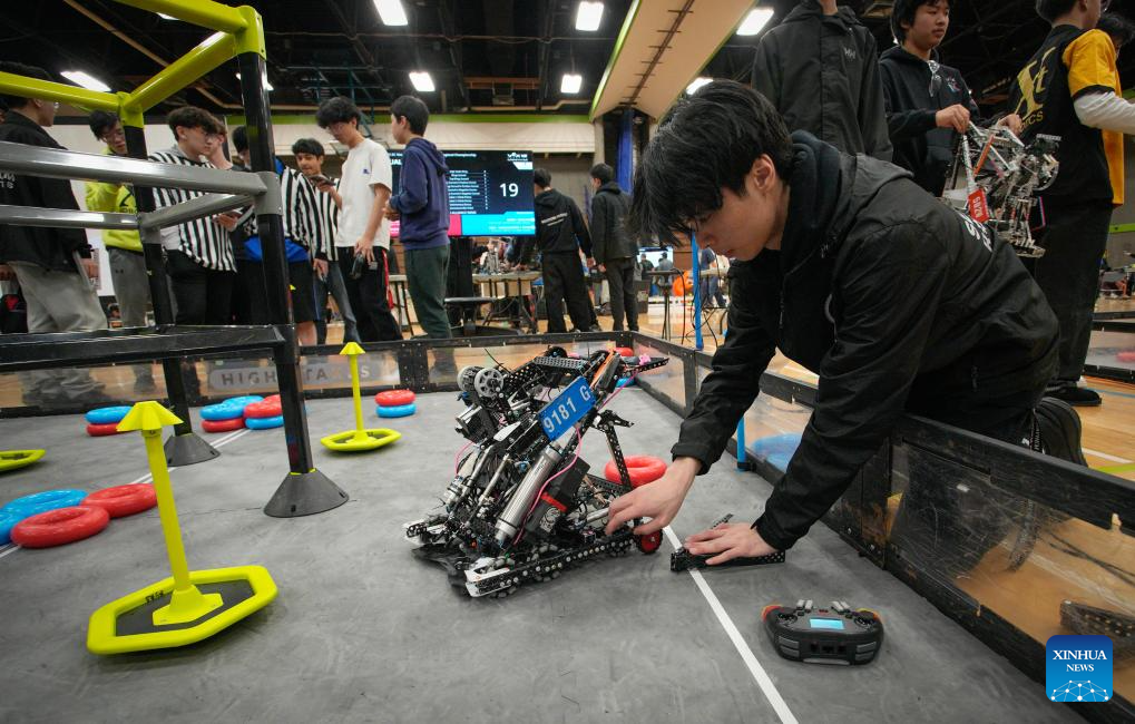Hundreds of high school students teamed up to compete in the competition here on Saturday, and winners will advance to the VEX Robotics World Championship in Dallas, United States, in May 2025. (Photo by Liang Sen/Xinhua)