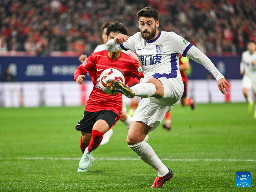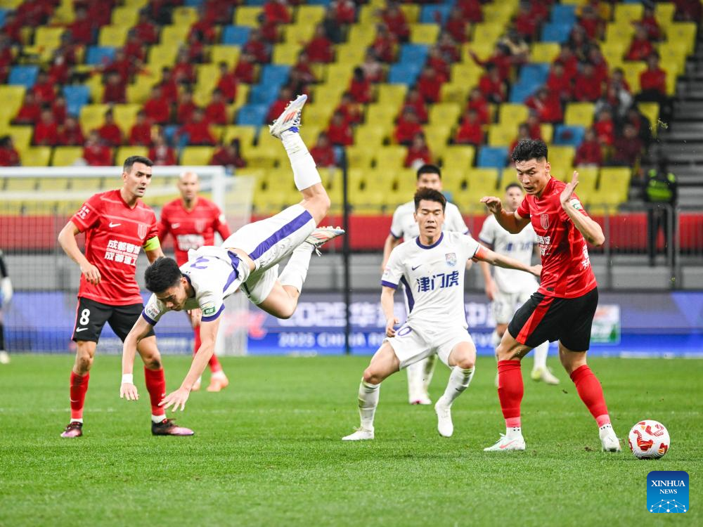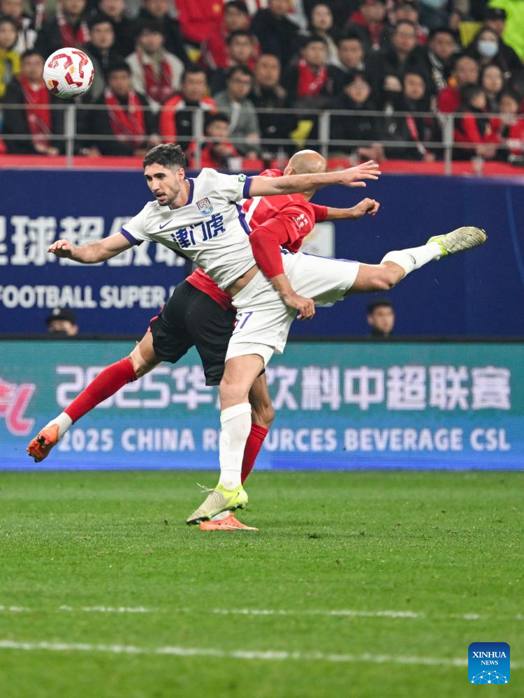 Xadas (R) of Tianjin Jinmen Tiger competes during the 2nd round match between Chengdu Rongcheng and Tianjin Jinmen Tiger at the 2025 season Chinese Football Super League (CSL) in Chengdu, southwest China's Sichuan Province, March 2, 2025. (Xinhua/Wang Xi)