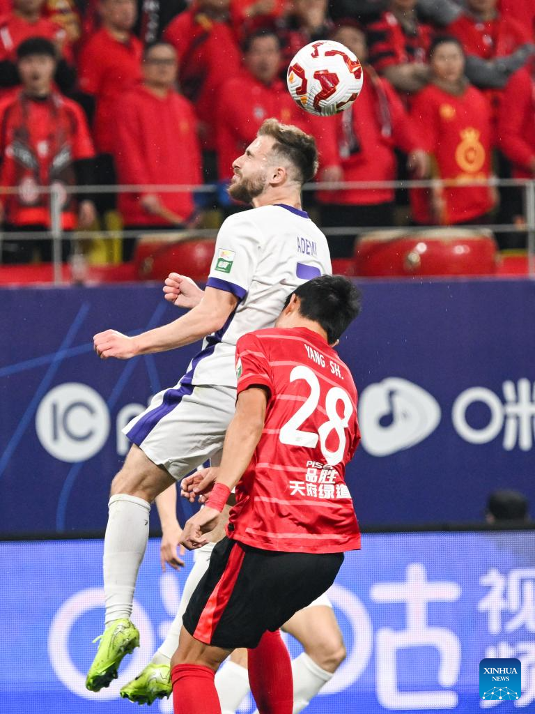 Albion Ademi (up) of Tianjin Jinmen Tiger vies for a header during the 2nd round match between Chengdu Rongcheng and Tianjin Jinmen Tiger at the 2025 season Chinese Football Super League (CSL) in Chengdu, southwest China's Sichuan Province, March 2, 2025. (Xinhua/Wang Xi)