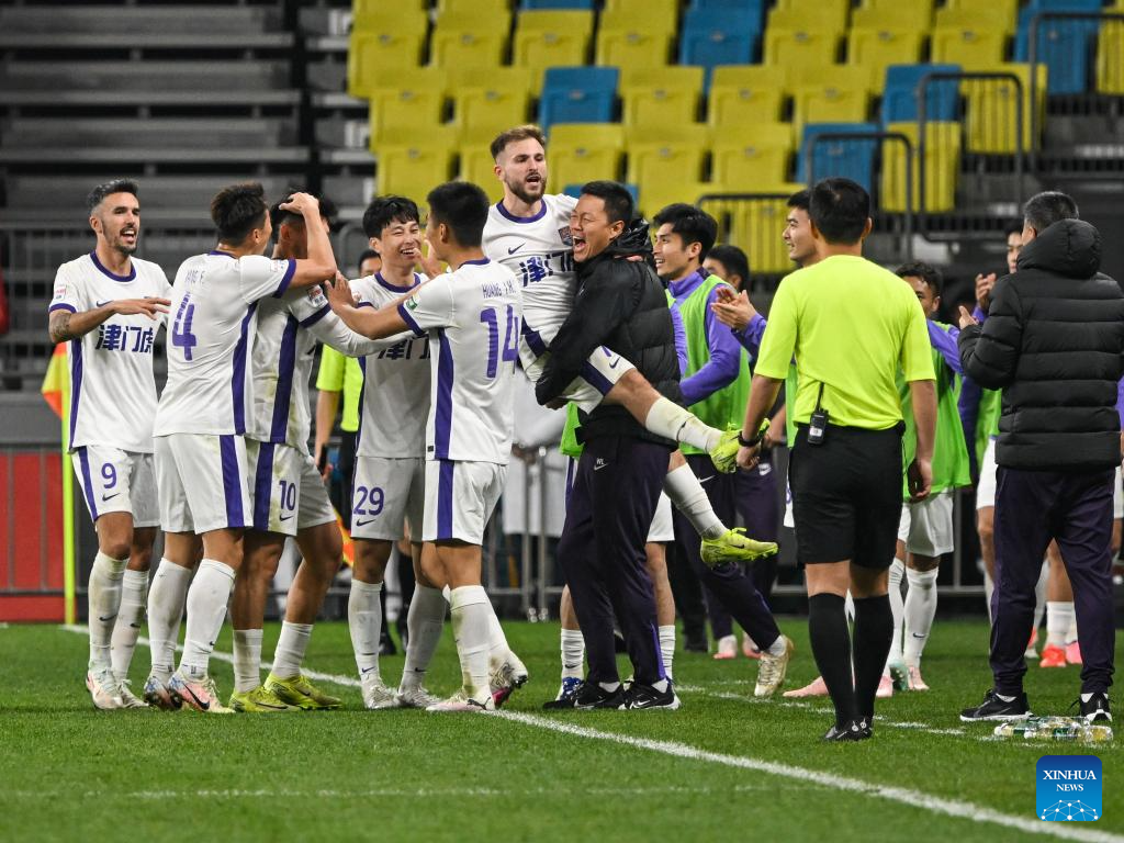 Members of Tianjin Jinmen Tiger celebrate a goal by Albion Ademi (up) during the 2nd round match between Chengdu Rongcheng and Tianjin Jinmen Tiger at the 2025 season Chinese Football Super League (CSL) in Chengdu, southwest China's Sichuan Province, March 2, 2025. (Xinhua/Wang Xi)