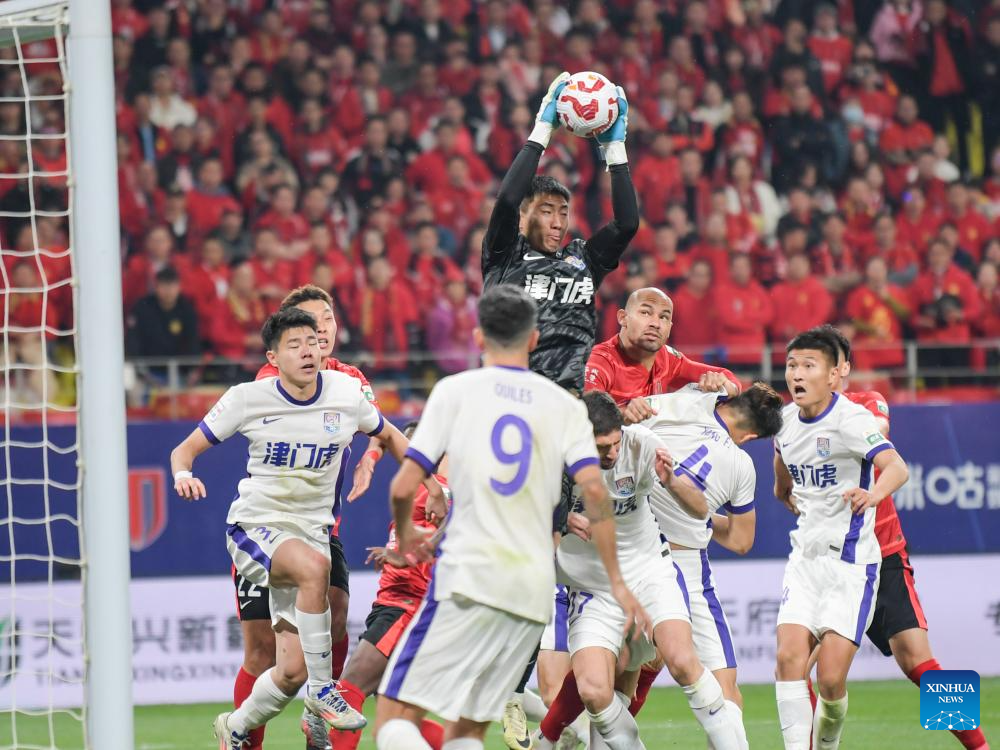 Fang Jingqi (up), goalkeeper of Tianjin Jinmen Tiger, makes a save during the 2nd round match between Chengdu Rongcheng and Tianjin Jinmen Tiger at the 2025 season Chinese Football Super League (CSL) in Chengdu, southwest China's Sichuan Province, March 2, 2025. (Xinhua/Wang Xi)