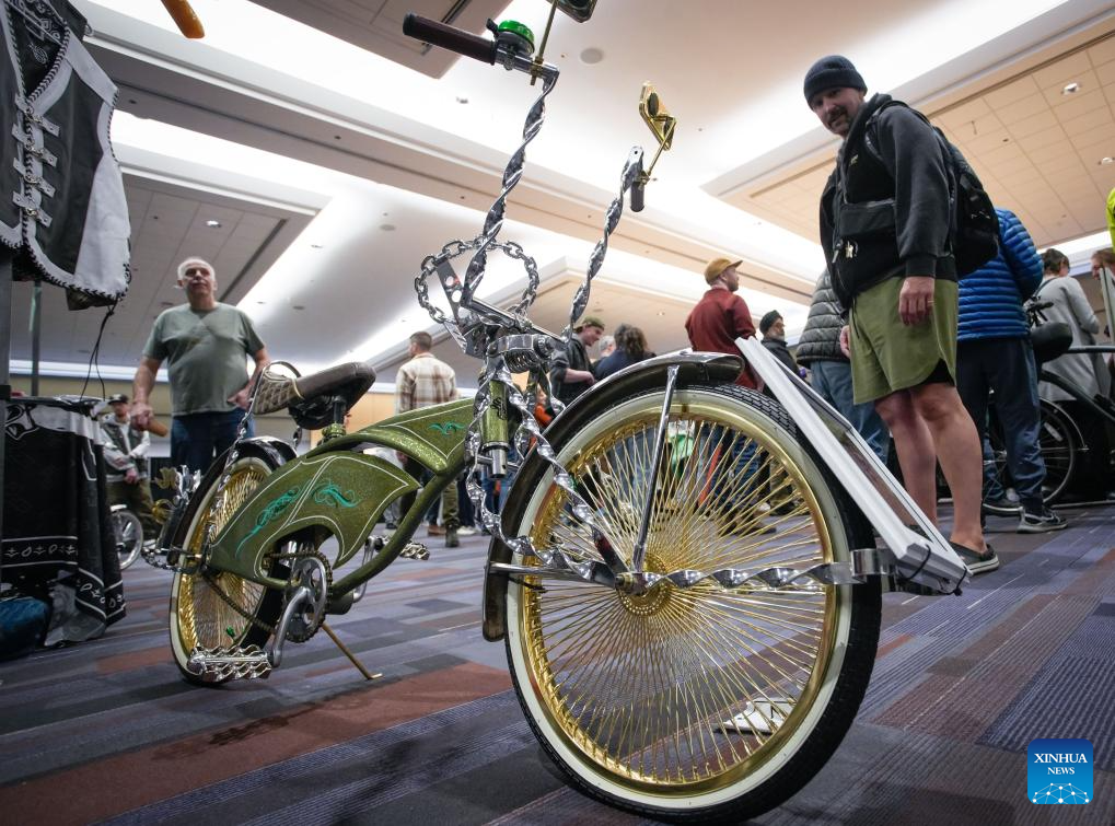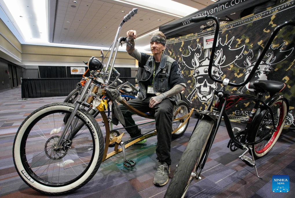A bicycle maker poses with his custom-built cruiser at the 2025 BC Bike Show in Vancouver, British Columbia, Canada, March 2, 2025.