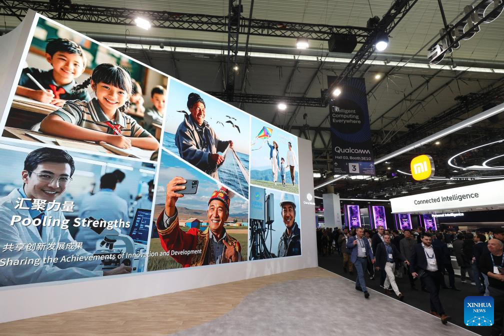 People walk past the booth of China Mobile at the 2025 Mobile World Congress in Barcelona, Spain, March 3, 2025. The 2025 Mobile World Congress (MWC) opened here on Monday, bringing together industry leaders, policymakers, and technology innovators to explore advancements in 5G, artificial intelligence (AI), and advanced connectivity.
