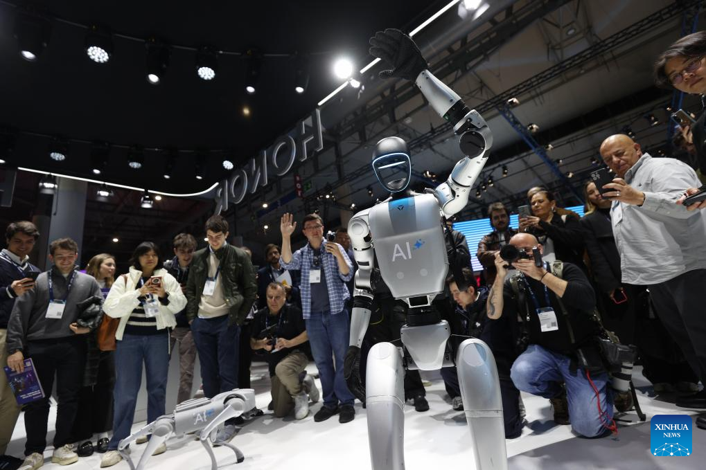 People watch the demonstration of a humanoid robot and a robotic dog at the booth of Honor at the 2025 Mobile World Congress in Barcelona, Spain, March 3, 2025. The 2025 Mobile World Congress (MWC) opened here on Monday, bringing together industry leaders, policymakers, and technology innovators to explore advancements in 5G, artificial intelligence (AI), and advanced connectivity.