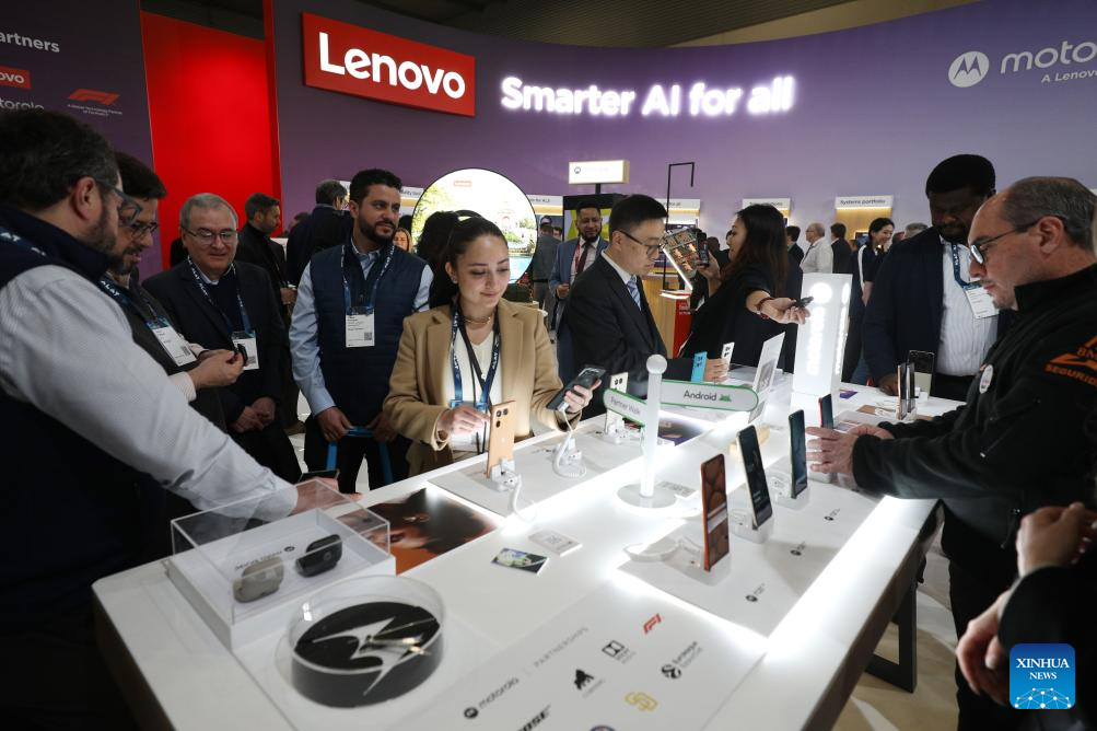 People visit the booth of Lenovo at the 2025 Mobile World Congress in Barcelona, Spain, March 3, 2025. The 2025 Mobile World Congress (MWC) opened here on Monday, bringing together industry leaders, policymakers, and technology innovators to explore advancements in 5G, artificial intelligence (AI), and advanced connectivity.