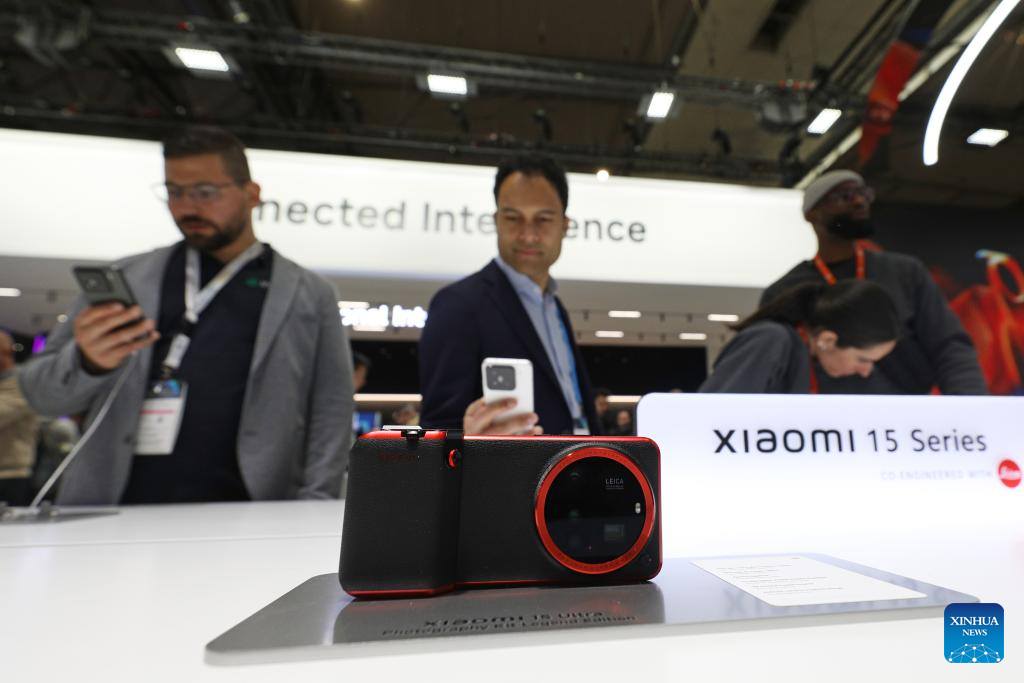 A Xiaomi smartphone is on display at the 2025 Mobile World Congress in Barcelona, Spain, March 3, 2025. The 2025 Mobile World Congress (MWC) opened here on Monday, bringing together industry leaders, policymakers, and technology innovators to explore advancements in 5G, artificial intelligence (AI), and advanced connectivity.