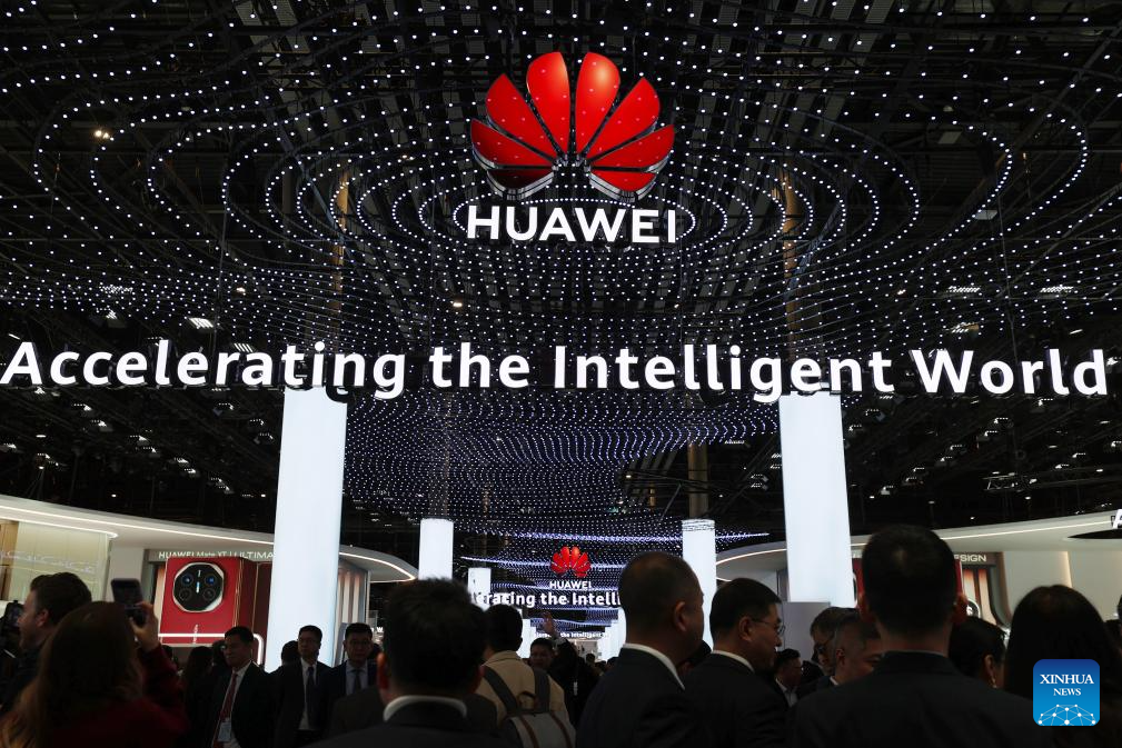 People visit the booth of Huawei at the 2025 Mobile World Congress in Barcelona, Spain, March 3, 2025. The 2025 Mobile World Congress (MWC) opened here on Monday, bringing together industry leaders, policymakers, and technology innovators to explore advancements in 5G, artificial intelligence (AI), and advanced connectivity.