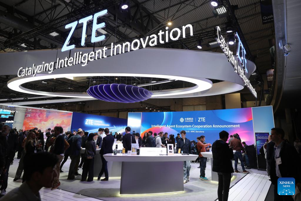 People visit the booth of ZTE at the 2025 Mobile World Congress in Barcelona, Spain, March 3, 2025. The 2025 Mobile World Congress (MWC) opened here on Monday, bringing together industry leaders, policymakers, and technology innovators to explore advancements in 5G, artificial intelligence (AI), and advanced connectivity.