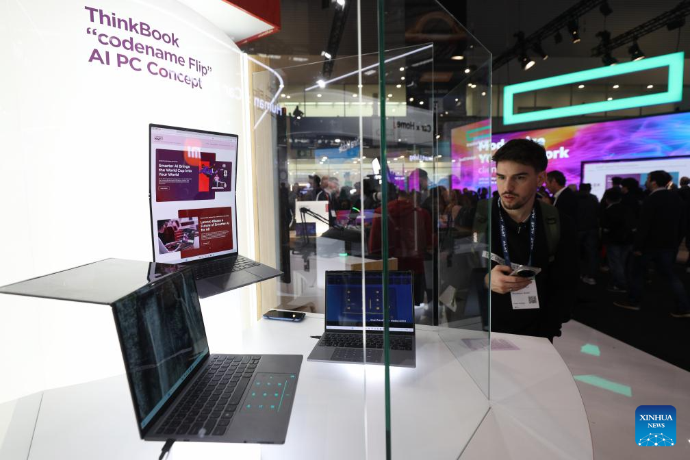 A man visits the booth of Lenovo at the 2025 Mobile World Congress in Barcelona, Spain, March 3, 2025. The 2025 Mobile World Congress (MWC) opened here on Monday, bringing together industry leaders, policymakers, and technology innovators to explore advancements in 5G, artificial intelligence (AI), and advanced connectivity.