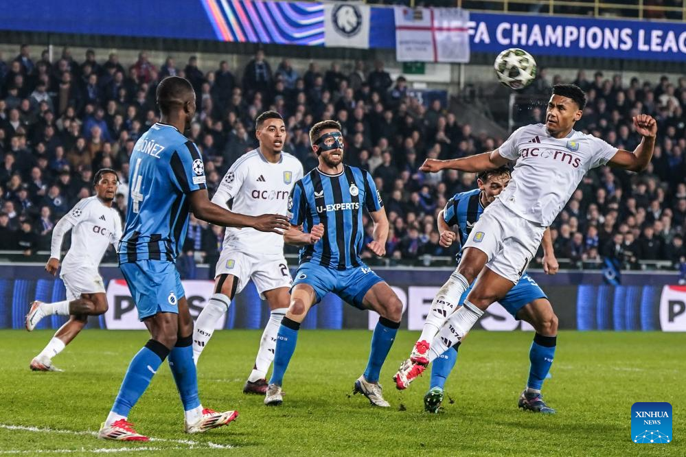 Ollie Watkins (Top R) of Aston Villa competes during the UEFA Champions League round of 16 match between Club Brugge and Aston Villa FC at the Jan Breydel Stadium in Bruges, on March 4, 2025. (Xinhua/Peng Ziyang)