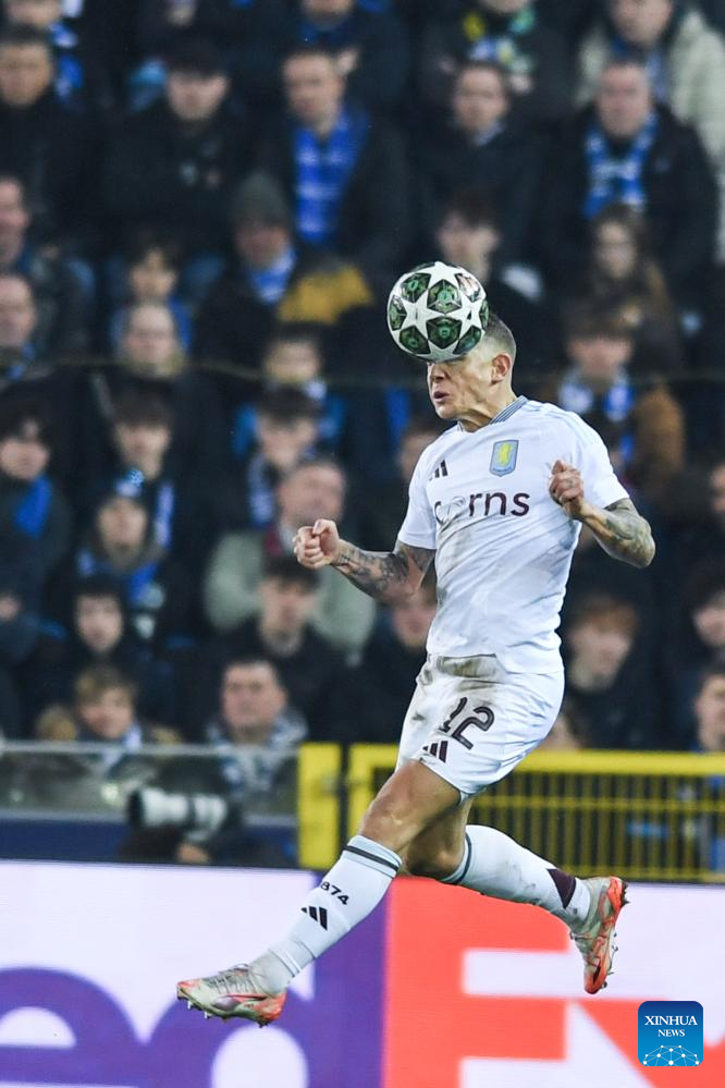 Lucas Digne of Aston Villa heads the ball during the UEFA Champions League round of 16 match between Club Brugge and Aston Villa FC at the Jan Breydel Stadium in Bruges, on March 4, 2025. (Xinhua/Peng Ziyang)