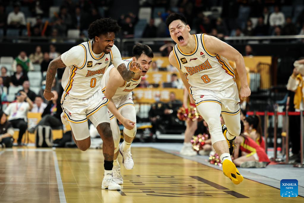 Zhang Ning (R) of Shanxi Loongs celebrates after scoring the match point during the match between Zhejiang Lions and Shanxi Loongs at the 2024-2025 season of the Chinese Basketball Association (CBA) league in Hangzhou, east China's Zhejiang Province, March 5, 2025. (Xinhua/Jiang Han)