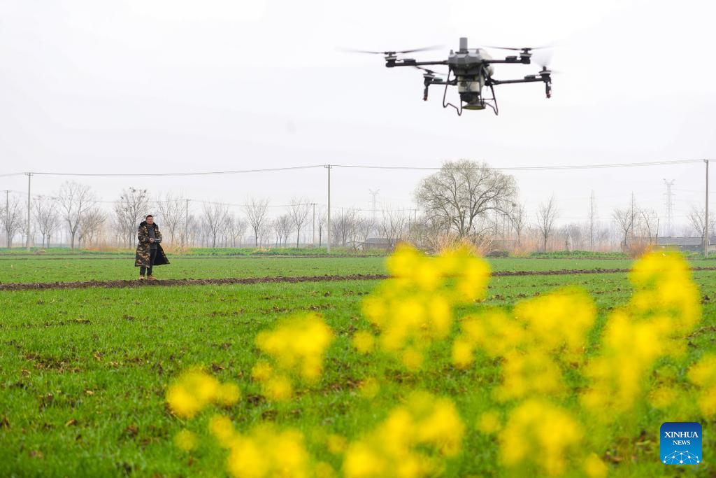 A farmer operates a drone to fertilize a wheat field in Xinghua City, east China's Jiangsu Province, March 5, 2025.
