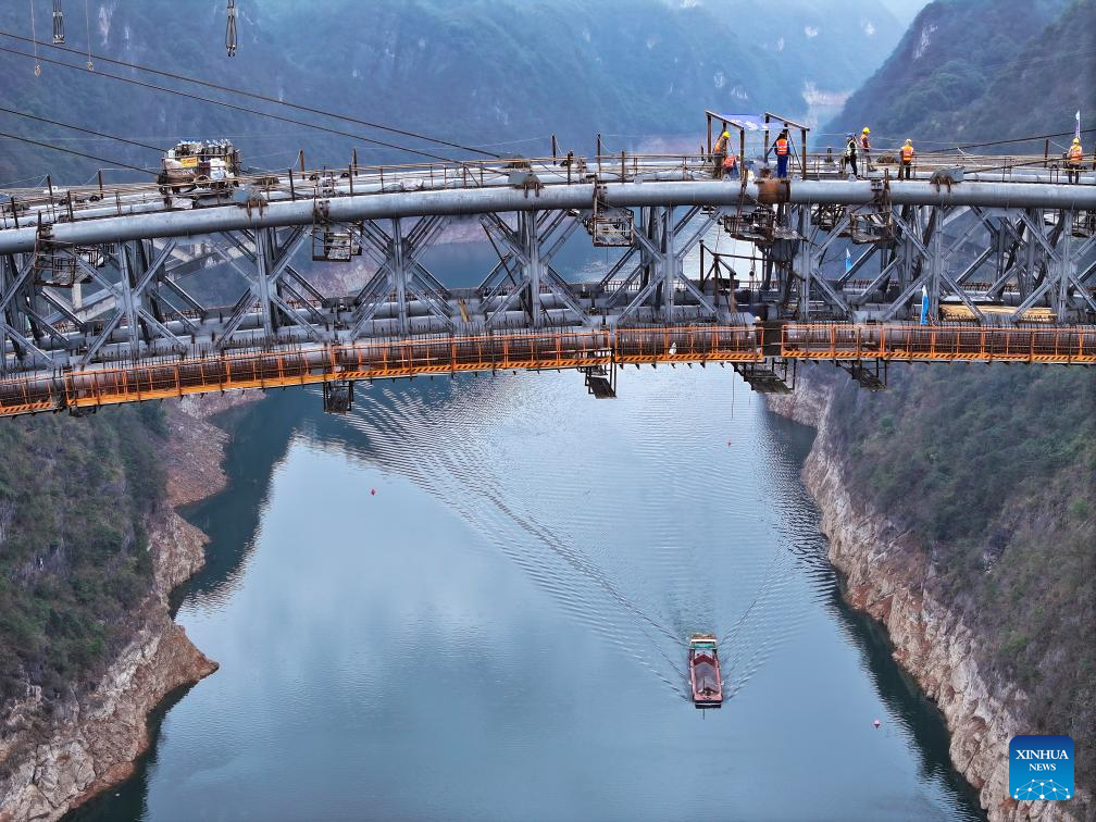 Construction of the main structure of the bridge was finished on Wednesday. The 520-meter bridge, with a span of 337 meters, has a vertical height of 200 meters from the bridge deck down to the river surface. (Xinhua/Liu Xu)