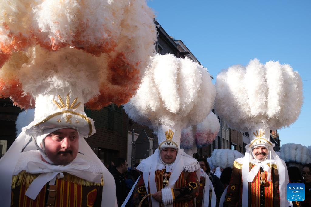 People wearing costumes of "Gille" attend the Binche Carnival, a UNESCO World Heritage event, in Binche, Belgium, March 4, 2025. (Xinhua/Meng Dingbo)