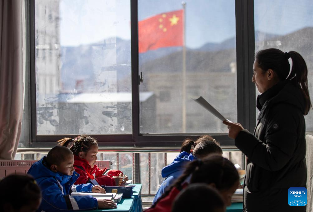Sixth-grade students from a severely-shattered township attend class at a temporary site in Dingri County, southwest China's Xizang Autonomous Region, March 5, 2025.