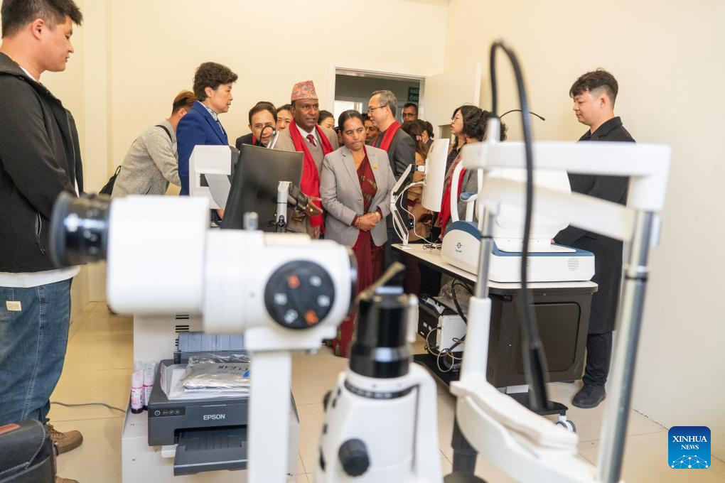 Guests inspect China-donated ophthalmic equipment and instruments to the China-Nepal "Lifeline Express" Center of Cooperation for the Prevention of Blindness in Kathmandu, Nepal, March 7, 2025. (Photo by Hari Maharjan/Xinhua)