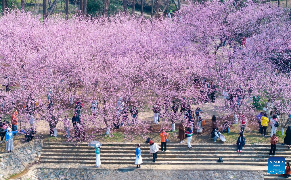 A drone photo shows people enjoying blossoms at a botanical garden in Nanjing, east China's Jiangsu Province, March 6, 2025. (Photo by Yang Suping/Xinhua)