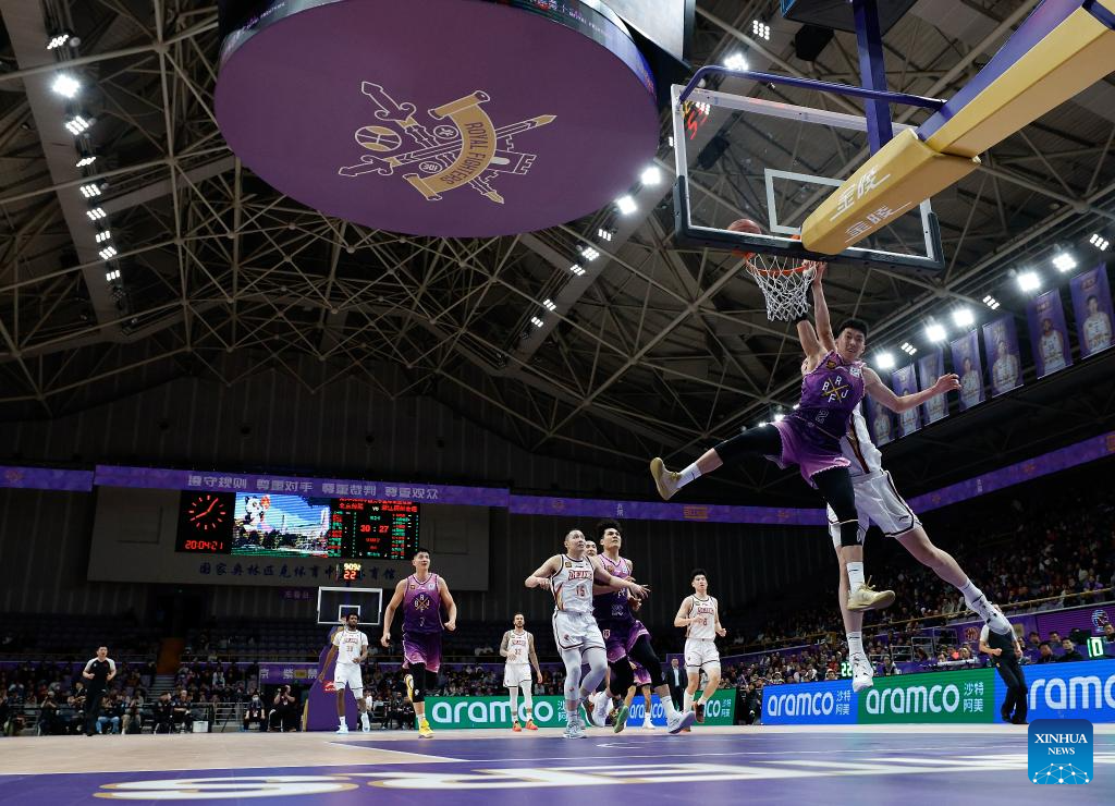 Liao Sanning (front) of Beijing Royal Fighters dunks during the 36th round match between Beijing Royal Fighters and Zhejiang Golden Bulls at the 2024-2025 Chinese Basketball Association (CBA) league in Beijing, China, March 6, 2025. (Xinhua/Wang Lili)