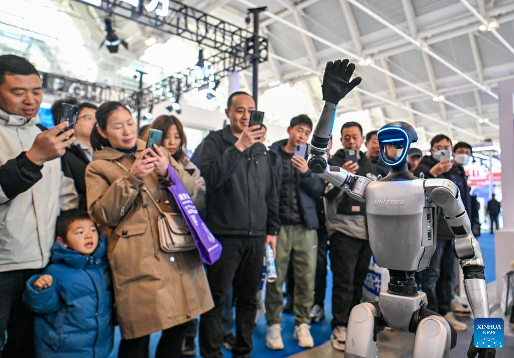 A humanoid robot from Chinese company Unitree Robotics performs during the 21st China International Equipment & Manufacturing Industry Expo (CIEX) at the National Convention and Exhibition Center (Tianjin) in north China's Tianjin, March 6, 2025.