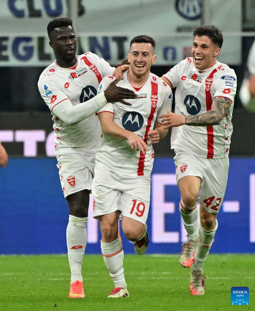 Samuele Birindelli (C) of Monza celebrates his goal with teammates during a Serie A football match between Inter Milan and Monza in Milan, Italy, March 8, 2025. (Photo by Alberto Lingria/Xinhua)