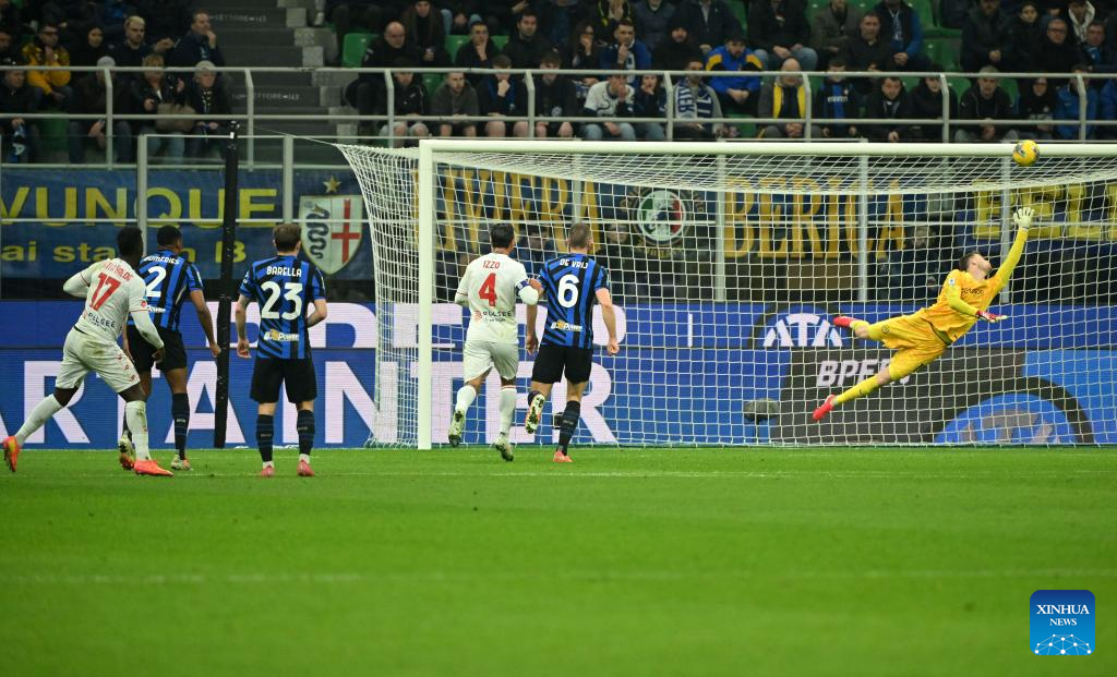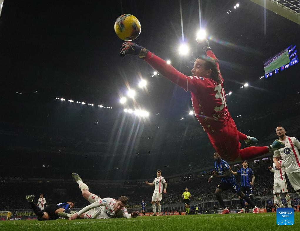 Stefano Turati (C) of Monza fails to save a goal during a Serie A football match between Inter Milan and Monza in Milan, Italy, March 8, 2025. (Photo by Alberto Lingria/Xinhua)