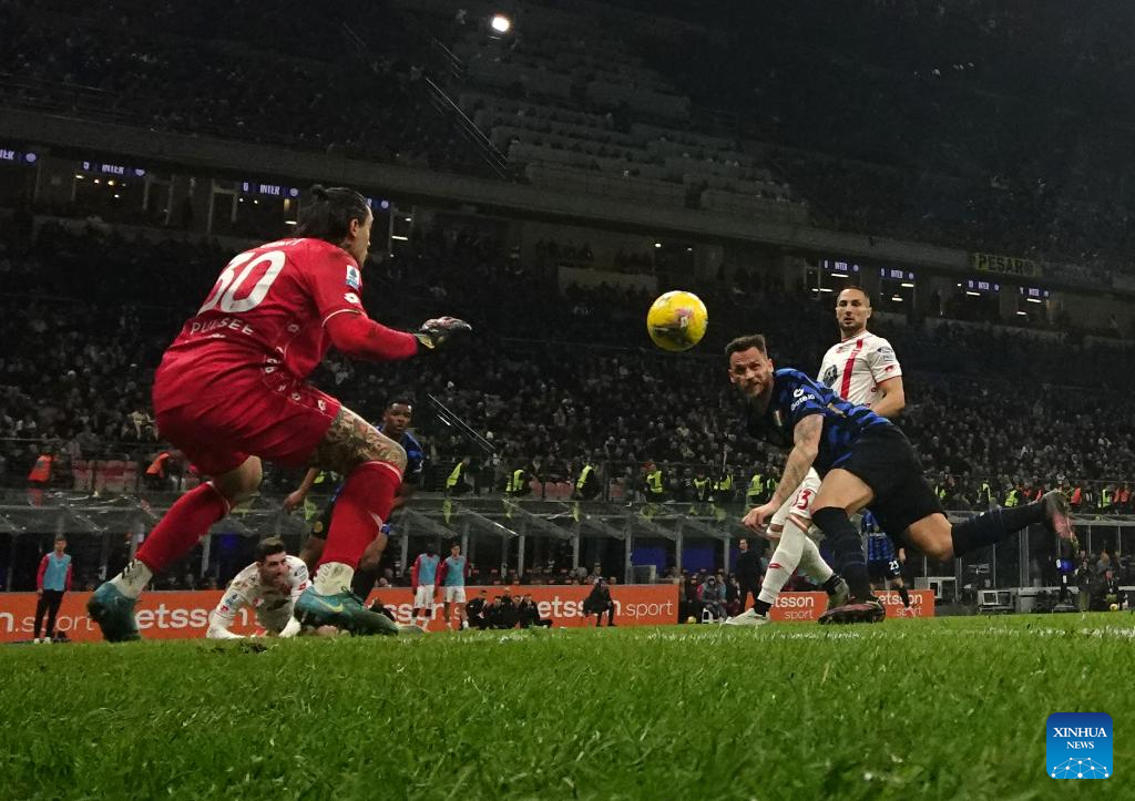Marko Arnautovic (2nd R) of Inter Milan scores his goal during a Serie A football match between Inter Milan and Monza in Milan, Italy, March 8, 2025. (Photo by Alberto Lingria/Xinhua)