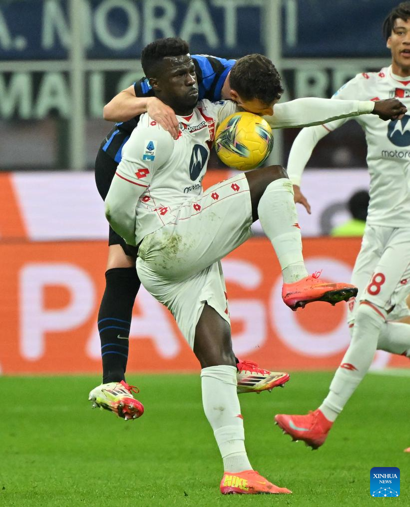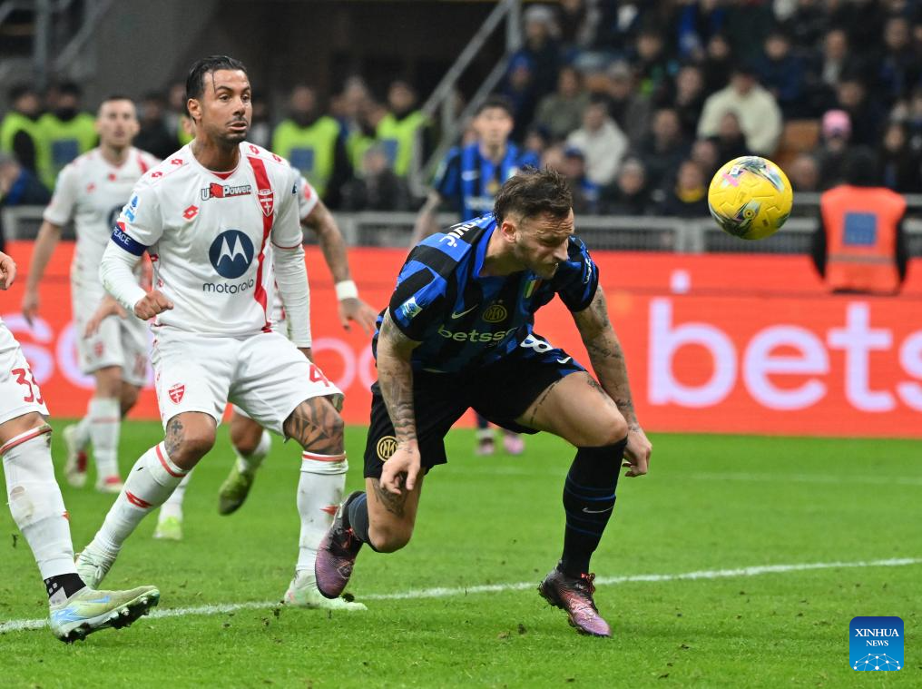 Keita Balde (1st L) of Monza scores his goal during a Serie A football match between Inter Milan and Monza in Milan, Italy, March 8, 2025. (Photo by Alberto Lingria/Xinhua)